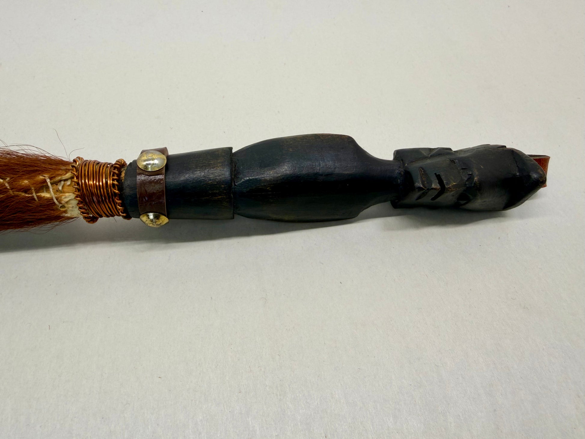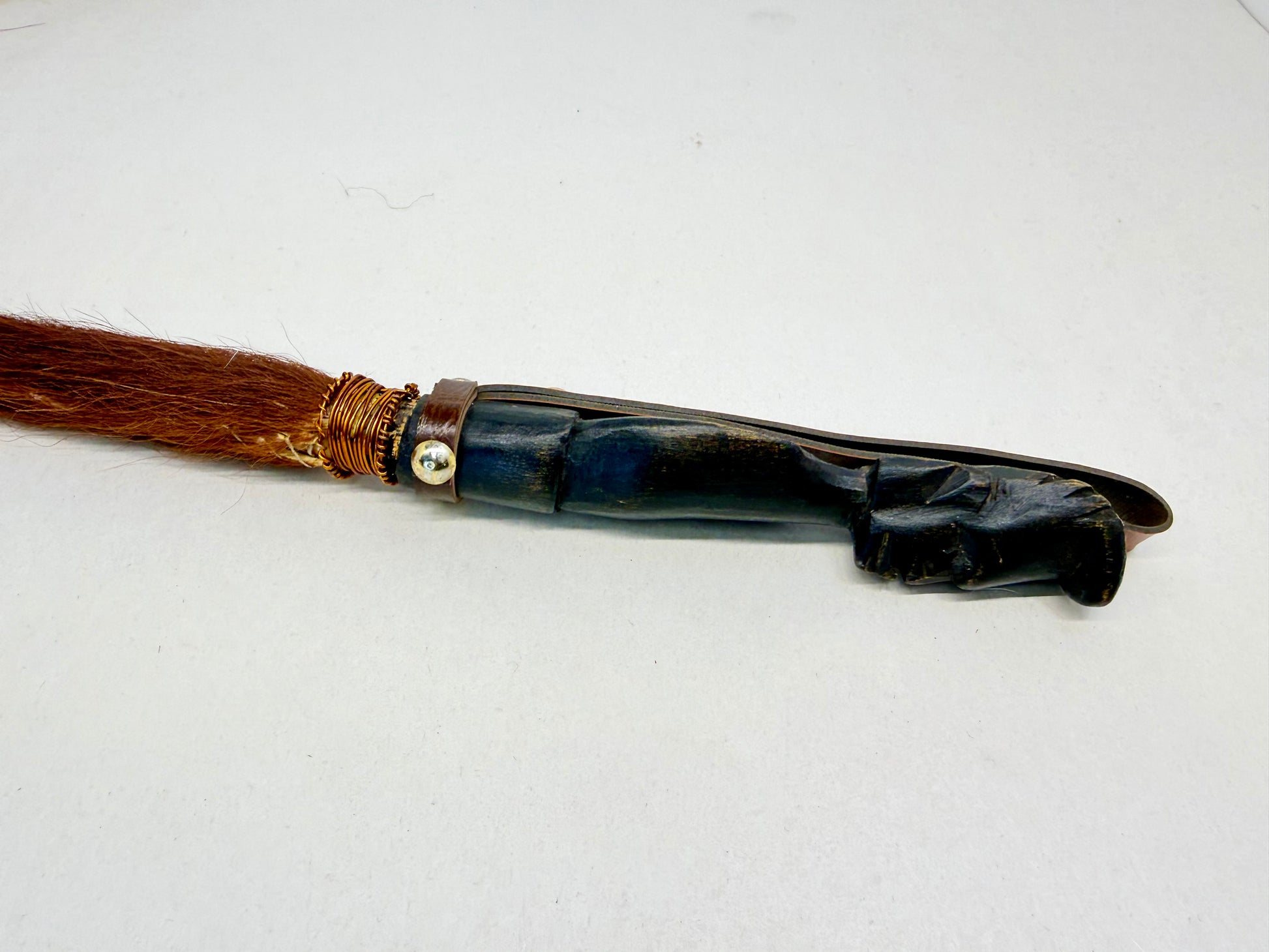 African Horse Tail Fly Swatter: Carved Wood Figure Handle